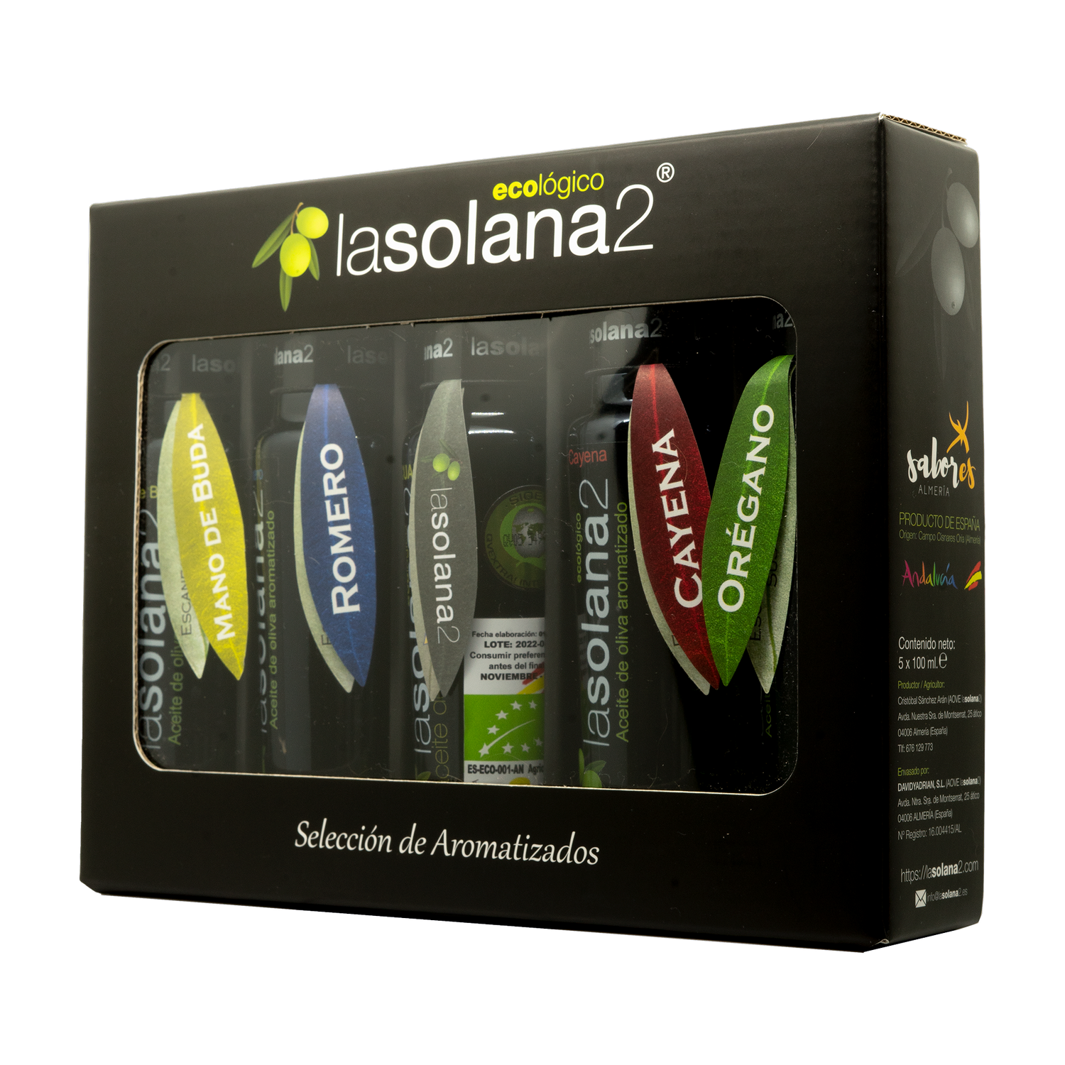 Este pack incluye cinco botellas de 100 ml cada una, elaboradas con nuestro AOVE Picual ecológico de recolección temprana. Las variedades son: Orégano, Mano de Buda, Romero, Cayena y una botella de AOVE Picual sin aromatizar. Todo presentado en un formato elegante, perfecto para disfrutar, compartir o regalar.
