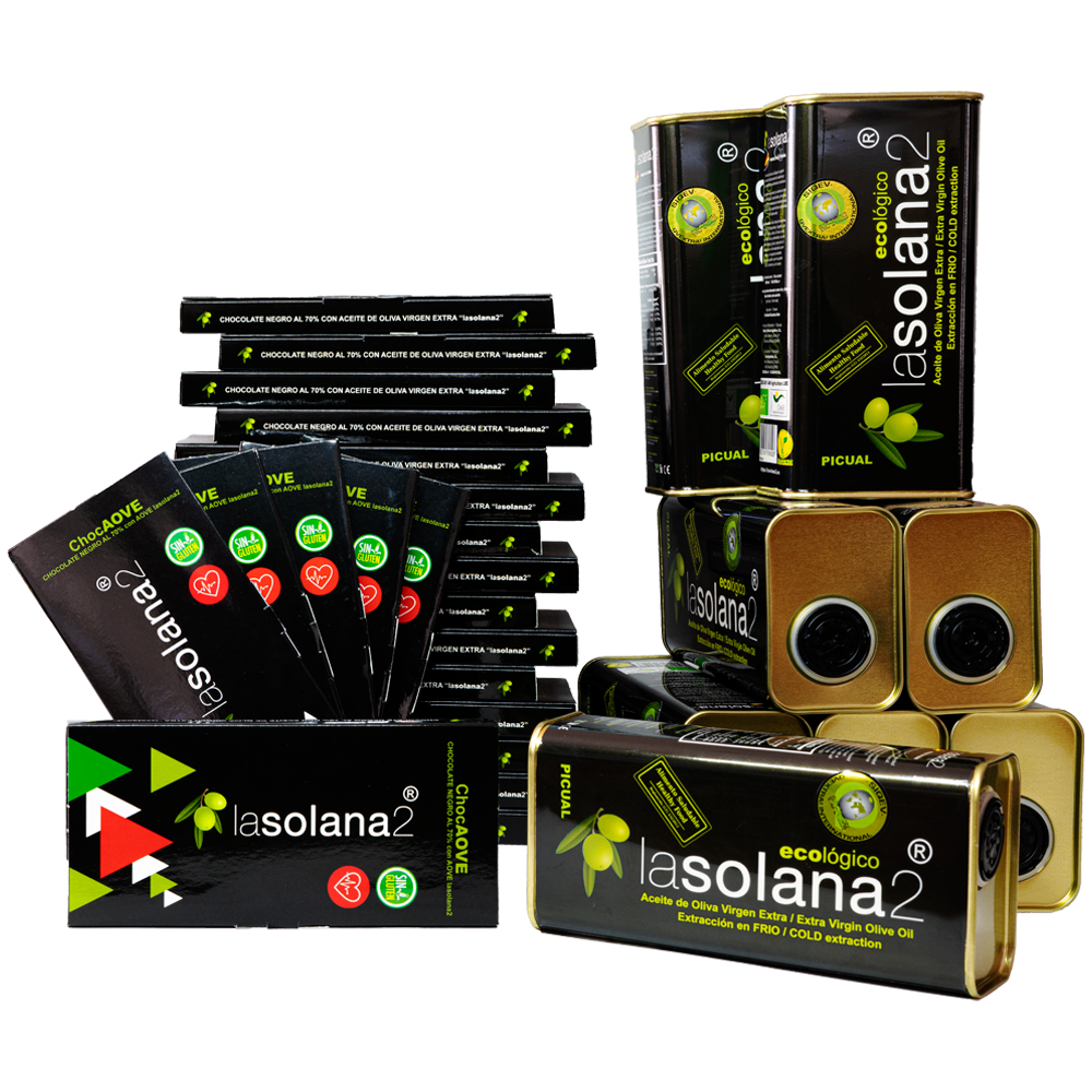 Cada pack combina nuestro galardonado AOVE Picual Ecológico en formato de 500 ml con la irresistible dulzura de ChocAOVE, el primer chocolate con aceite de oliva virgen extra de LaSolana2.